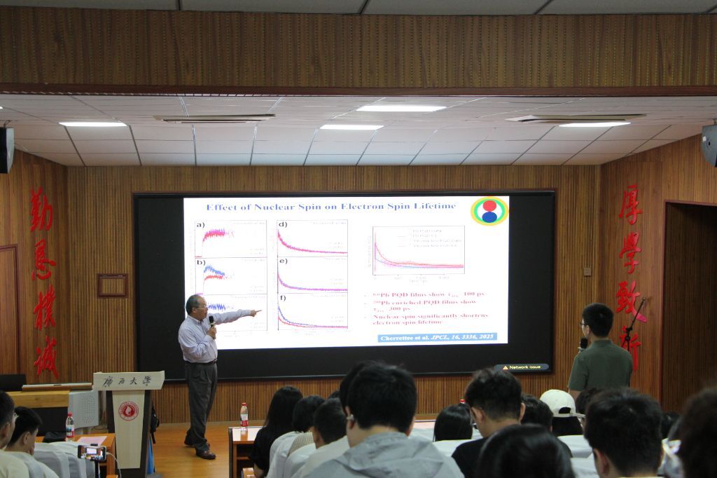 互动环节中,张金中教授就钙钛矿材料手性放大策略和载流子自旋动力学等问题,与在场师生进行了深入探讨,现场气氛热烈,学术氛围浓厚。