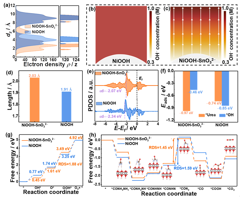 针对这一难题,研究团队以金属间化合物Ni3Sn2为前驱体,构建了Brønsted碱SnO32−插层的NiOOH催化体系(NiOOH-SnO32−),并通过原位表面重构实现了活性相的精准调控。研究发现,SnO32−插层能够改变NiOOH表面的电荷分布,使其带负电,从而通过静电排斥有效抑制OH−的强吸附。同时,SnO32−插层可拉伸Ni−O键并上移Ni的d带中心,从而增强了尿素分子的吸附与活化能力。这种双重效应有效提升了尿素氧化反应速率,同时显著抑制了析氧副反应的发生。该研究提出了一种通过调控活性位点竞争吸附实现高选择性尿素氧化的新策略,为低能耗、高效率处理高浓度尿素废液提供了新思路。