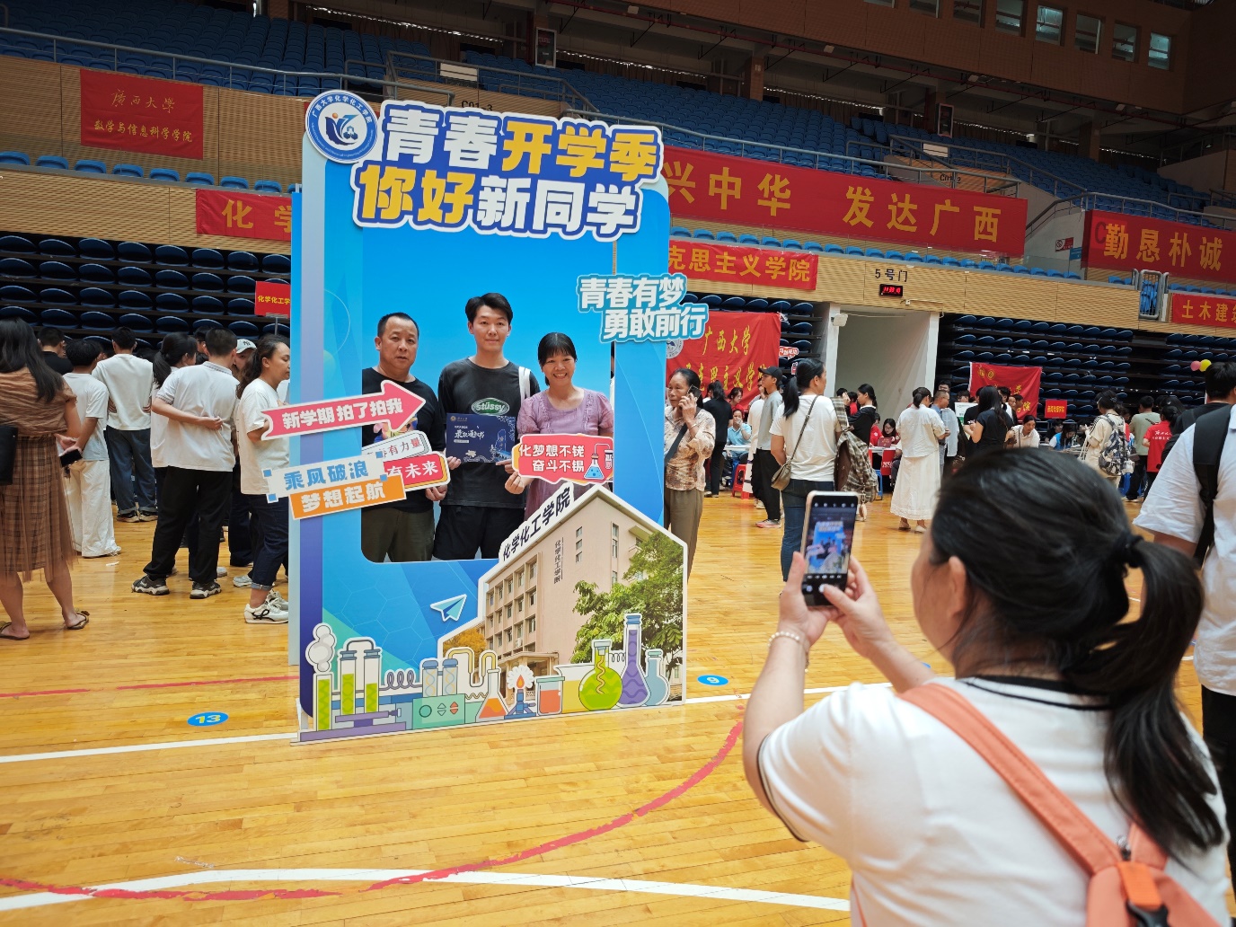 迎新现场,学院特别设置了融合化学学科元素的创意拍照打卡框,吸引众多新生及家长驻足合影。一张张笑容洋溢的照片,不仅成为新生踏入大学的美好见证,也增强了他们对学院的归属感和认同感。